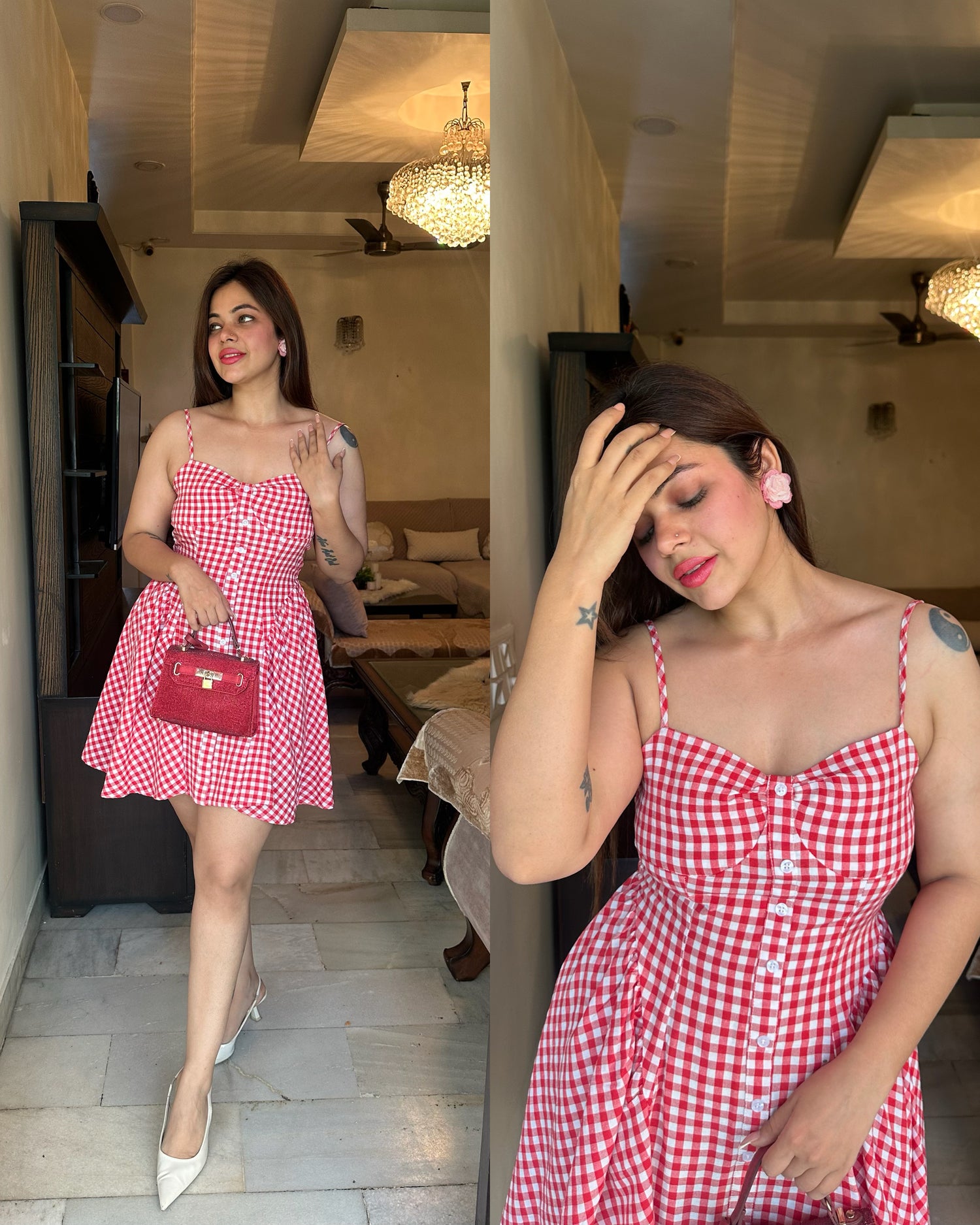Red white checks cotton dress