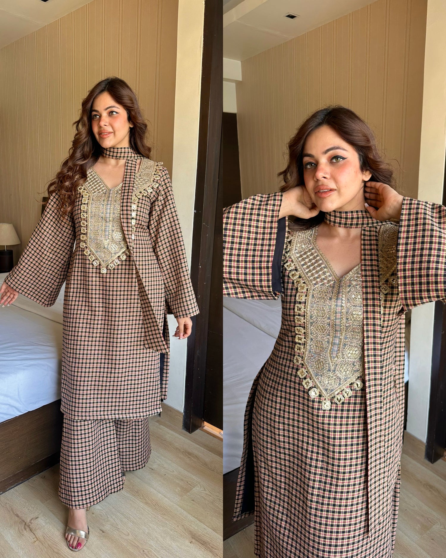 Nude beige woollen checks suit