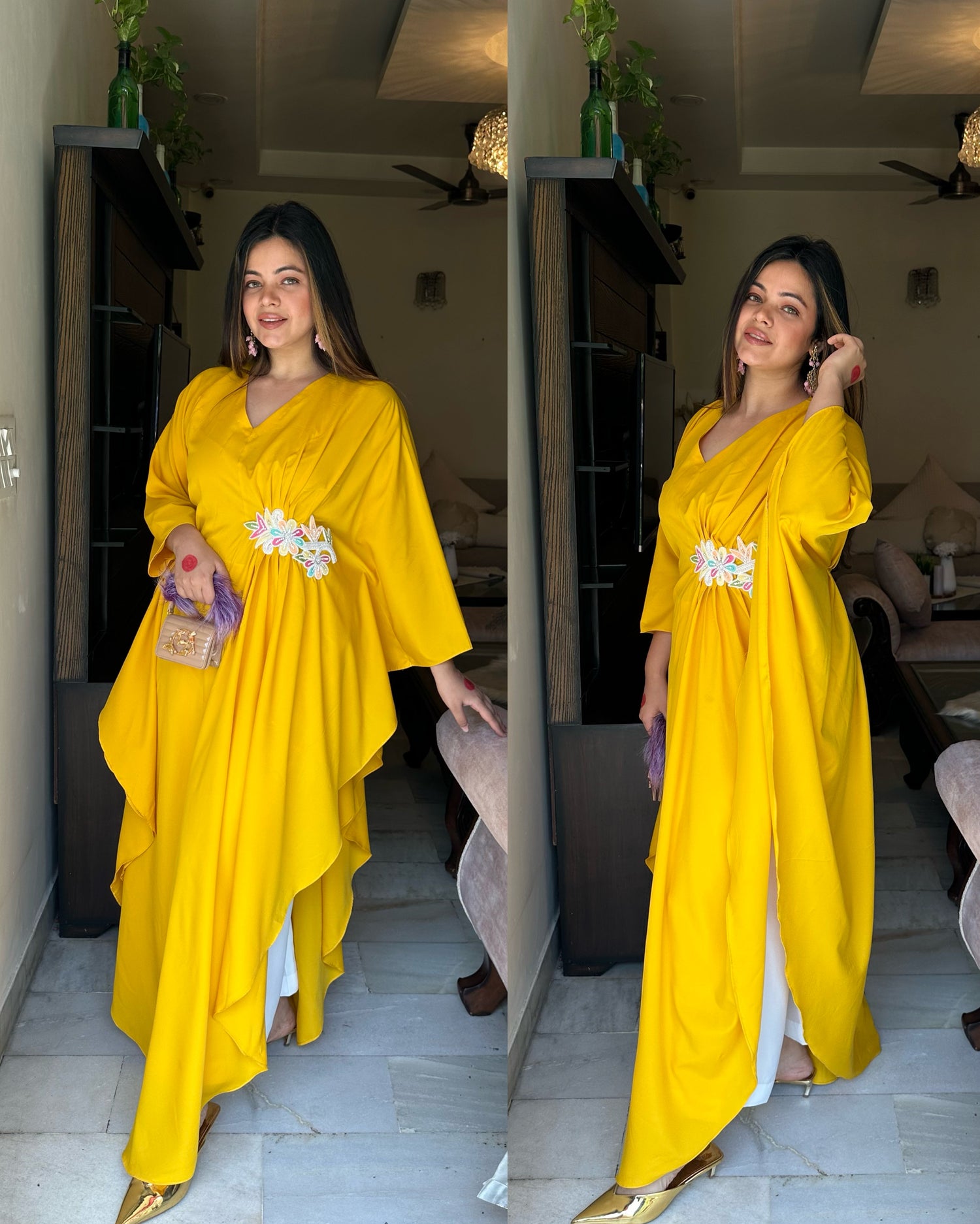 Poly crepe soft fabric. Easy fit and flowy. Plazzos. Embroidered patch.